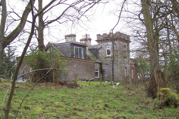 Its crowstepped western gable faces on to the road and is made of snecked sandstone rubble. The windows here are symmetrically placed, with two windows on the attic floor over three on the ground floor. To the left (north) was a two-storey corbelled and battlemented tower. The main door fronted the drive which lay on the south side of the house.