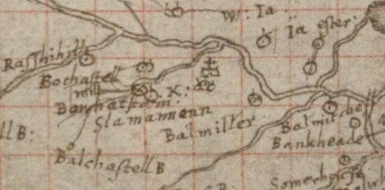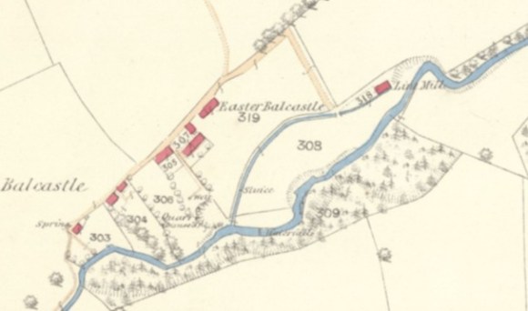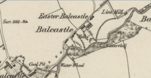 There are few references to the mill but the fact that it appears on Pont’s map of c1580 shows that this was a baronial mill. In the 15th century the principal landowners were the Sandilands, the Livingstones and the Cunninghams (Reid 2010). Balcastle Mill appears to have been associated with the Livingstones and would have been the mill mentioned in a retour of 1585 :