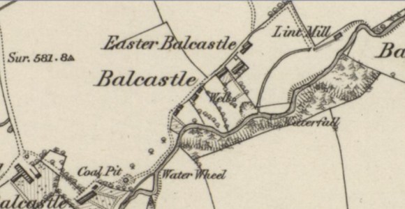 A “Water Wheel” on the Culloch Burn a little east of Balcastle House is noted on the 1860 Ordnance Survey map. No buildings are associated with it, but a coal pit is shown very close by. It therefore seems probable that the wheel was used for pumping water out of the pit, as occurred at Westfield near Airth.