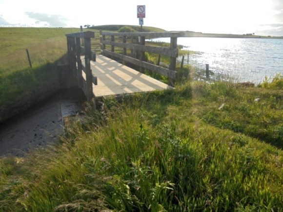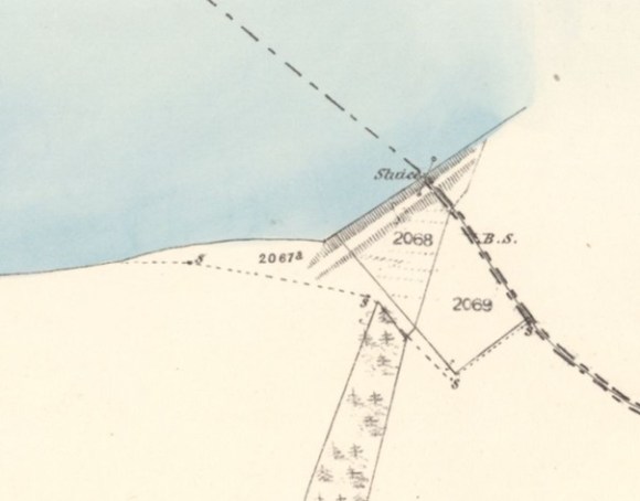 An earth embankment was constructed at the south-east end of the loch so that the water level could be raised. March or boundary stones engraved “FCN” were placed around the land owned by the Forth & Clyde Canal Navigation. Some of these are marked on the 1858 Ordnance Survey map near to the sluice, but most have now been requisitioned by locals in Limerigg for use as garden ornaments. Similar stones may still be seen in situ at the Hillend Reservoir at Caldercruix into which the water flows.