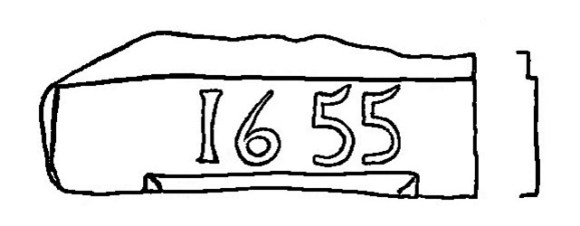 A short lintel from a window with a chamfered inner margin and backset out margins was reused in the fabric of an outbuilding at Bulliondale near Avonbridge. It is inscribed “1655.”