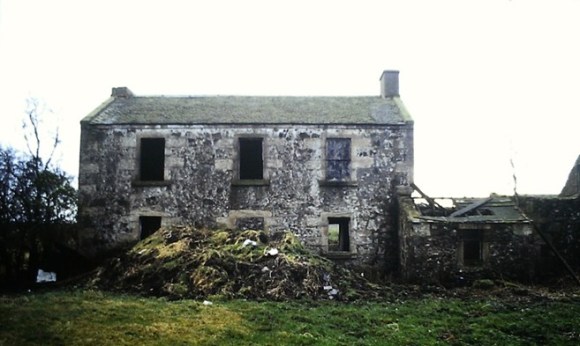The present farmhouse was built in 1831 and that date can be found on the lintel of the central window on the north side of the building. This façade, like that on the south, has a central doorway with a window to either side and three windows on the upper floor disposed symmetrically above the voids below.