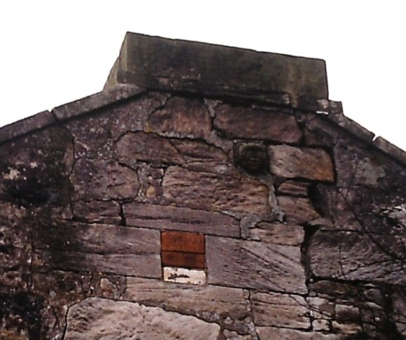 To maintain this symmetry the window above the door on the south front was blank; as was that on the top right on the north side. The walls are of random rubble with dressed sandstone margins. The low-pitched slate roof is bordered by plain skews, capped with chimney stacks. The east gable contains a small garret window (bricked up in 1989), slightly set off to the south. Centrally above this is a carved stone face. Such carvings are to be found elsewhere in this part of Avonbridge.