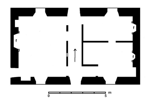 Inside, the dwelling conformed to the usual arrangement for this area. The main door opened onto the foot of the stair with doors to either side. That on the left entered a large room with a big fireplace on the centre of the gable wall. That on the right gave access to two rooms, each with a fireplace – a living room and a retiring room. The large room had two closets and presumably originally functioned as the kitchen/hall. At a later date a doorway was cut through the south-west corner to provide a passage to the dairy.