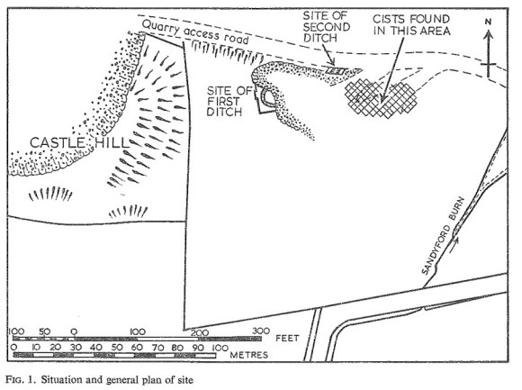 Cists were found on or near the Castle Hill in the early 19th century according to the NSA. Then, in the early 1960s “stone coffins” were reputedly destroyed during gravel extraction which took away the west side of the Hill (Marriot 1968, 86). More were discovered in 1965 immediately to the east of the Hill, between it and the Sandyford Burn.