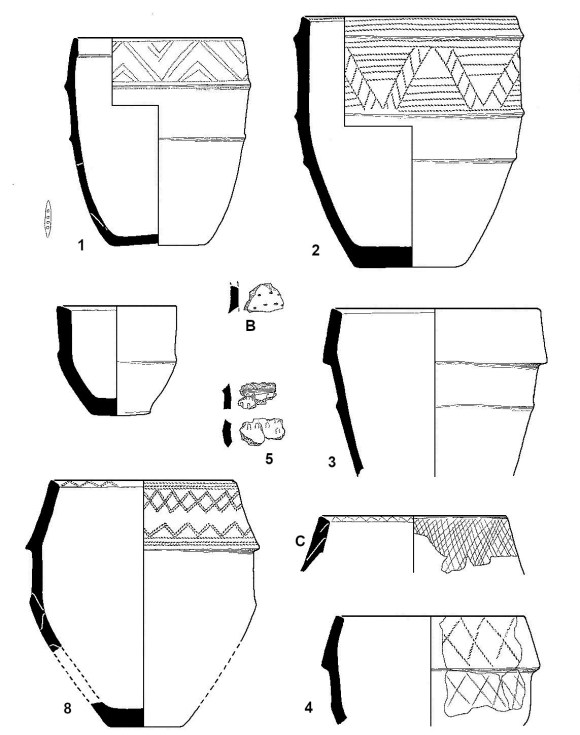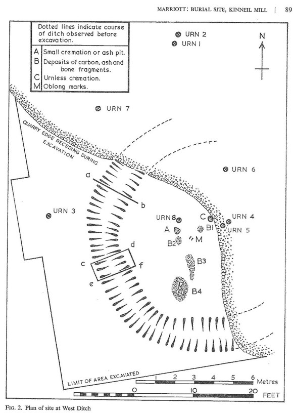 Several were removed before archaeologists recorded the two remaining ones. These were short cists, one containing a crouched inhumation and the other a Food Vessel. The finds are in the National Museum of Scotland. The excavation also revealed a ring-ditch, c11m in diameter, within the area of which were several cremation burials and four cinerary urns. A bone toggle or bead came from one of these. Areas of burning within the ditch suggested that cremations has taken place on the spot. However, as one of the urns protruded above the level of these burnt patches it is likely that a mound or barrow covered them. Three more urns were found in the vicinity and part of a second ditch hinted at a similar enclosure to the north-east (Marriot 1968). A radiocarbon date of 1880-1600BC was later obtained from cremated bone associated with one of the cordoned urns