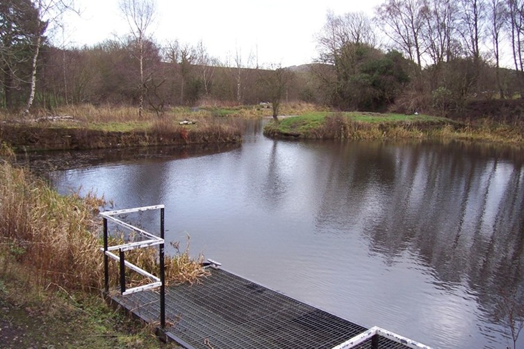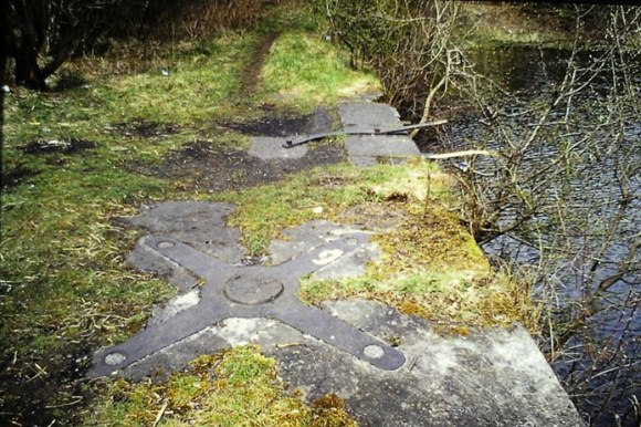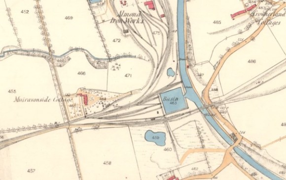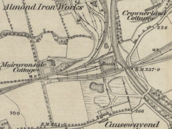 In June 1854 Messrs Russel & Co obtained a feu from Forbes of Callendar of part of Almond Estate at Causewayend for erecting an ironworks and within a short time it was producing pig iron on a large scale. Extensive railway sidings were placed immediately to the north of the basin to serve the works and it appears that this is when the pig iron was loaded onto the barges there. Almond Iron Works closed in 1881 after a short but very profitable period of trading. Because the Causewayend Basin was used for a relatively short period and for a limited range of goods it never developed the infrastructure of other inland ports. There were no warehouses, workers’ housing, offices, maintenance yards, and so on. Some form of office was necessary to handle the paperwork connected with the transit and transfer of goods – and we do know that passenger tickets were sold here. The initial enthusiasm that led to the construction of the dock must have been extended to an office and it is probable that Almond House (originally known as Muiravonside Cottage) was built for the manager (see SMR 860). It stood on the hill overlooking the basin. It was subsequently acquired for the manager of the Almond Ironworks, and later rented to senior officials at neighbouring collieries. The few workers employed at the basin would have been accommodated in the nearby hamlet at Causewayend. In the field between it and the basin clay was extracted from large pits which flooded upon being abandoned. A light railway took the clay to the loading platforms at the basin and this was routed through an under-bridge when the mainline was extended eastwards.