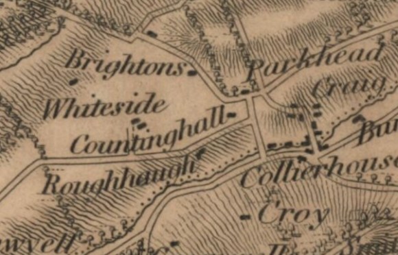 The Scots’ word “compt” translates as “count” or “an account, register or inventory,” and as such may refer to the annual assessment made of the livestock when they returned from the summer pasture on Redding Muir (ibid). On Grassom’s 1817 map it is appropriately denoted as Countinghall and by then a two-storey stone farmhouse had been built on the south side of the four acres of land feued in 1803, fronting the private lane called Roughhaugh Road.