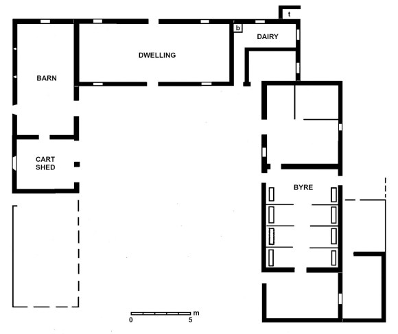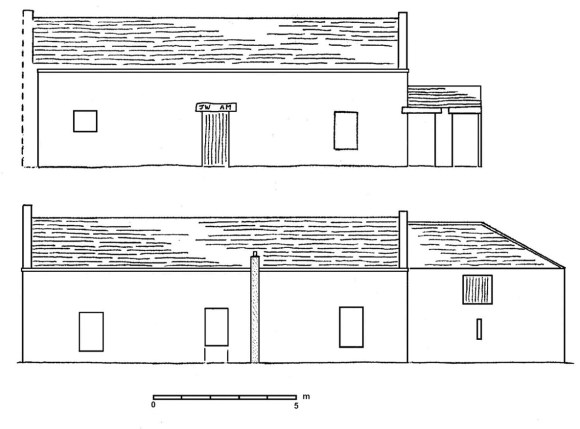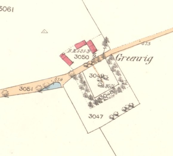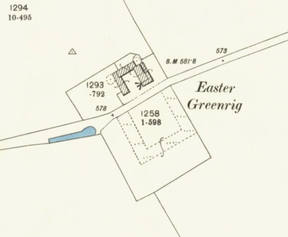 The lintel on central doorway at Easter Greenrig Farm has the initials “JW AM” but no date. This dwelling formed the main block of the courtyard of farm buildings from about 1870 onwards. However, the 1860 Ordnance Survey map shows that before then the west wing was detached and on a different orientation. It is therefore tempting to date the inscribed stone to the creation of the courtyard.