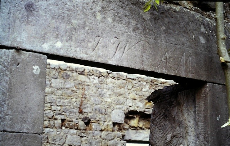 The lintel on central doorway at Easter Greenrig Farm has the initials “JW AM” but no date. This dwelling formed the main block of the courtyard of farm buildings from about 1870 onwards. However, the 1860 Ordnance Survey map shows that before then the west wing was detached and on a different orientation. It is therefore tempting to date the inscribed stone to the creation of the courtyard.