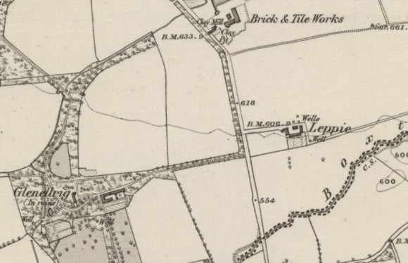 Falkirk Herald 11 October 1860, 1: “BRICK AND TILE WORK, NEAR SLAMANAN, STIRLINGSHIRE, TO LET. THE BRICK and TILE WORK, at Glenellrig, in the Parish of Falkirk, is to LET, with Entry at Martinmas. It is situated close by Slamannan, and in a district where Drain Tiles are required. The present tenant does not offer, and is willing to dispose of the steam engine and other articles necessary for the work. For particulars, apply to Mr Sconce, Royal Bank, Stirling…”