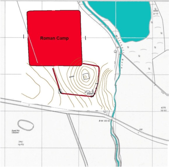 They enclosed the knoll within an annexe. Although all of the graves discovered lay within this enclosure that is due to the fact that the excavation trenches were confined to that area. It is not known if the old ditch was still open or if it formed the boundary of the graveyard. That is certainly a possibility as elsewhere there is evidence that most Roman camp ditches were left open upon abandonment. At Kintore it was suggested by the excavator that the Roman camp was avoided for residential settlement for some considerable time after the Roman withdrawal and it was hinted that the reason for that may have been that the Roman army was in the habit of reusing the same sites over and over again on its campaigns. It is therefore likely that the ditch was still recognisable when the cemetery was initiated.