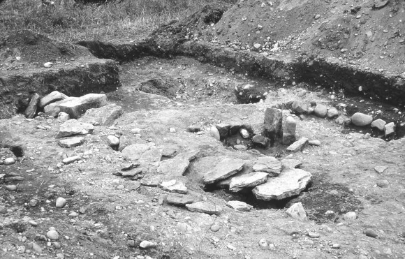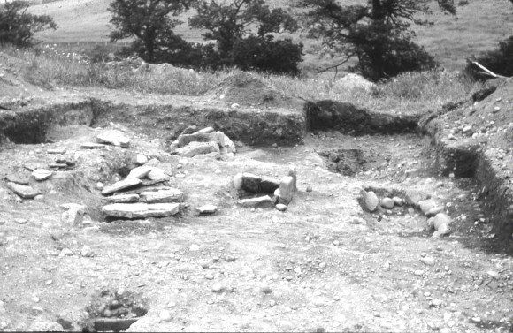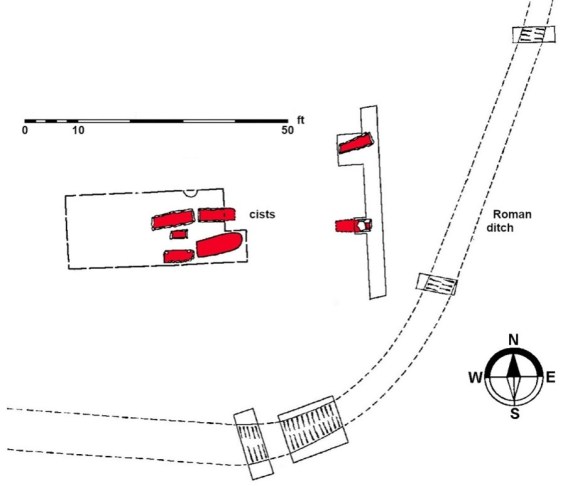 The limited archaeological excavation was undertaken to determine the line of the annexe ditch in advance of the motorway construction and did not examine the limits of the small cemetery. Seven graves and a pit were revealed, though in only two of the graves were traces of bones found. Four of the graves were lined with rounded cobbles and small slabs of split sandstone had been placed on the base of at least three. Some of the stone was dressed and must have been derived from an earlier building. The cists were of the “long” variety with the exception of one which was short and may have been for a child. Such long cists are usually 7th-10th century in date.