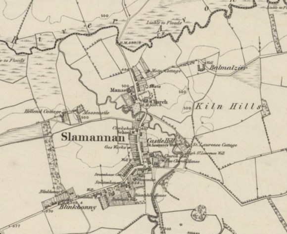 - KILN HILLS: “Two small eminencies on the farm of Balmulzier and Hillhead. The writer of the Statistical of this parish, calls these hills “Kill Hills”, assumes it to have been the scene of a battle, and supposes the name to have originated from the number of persons then killed, and that the remains of a trench existed on them. All the authorities in the locality assert that these statements are incorrect, and that the same was derived from the number of malt kilns which existed along the sides of these clay hills some years back, and when smuggling was carried on on a large scale throughout the parish. The existence of the ditch they consider imaginary. The farmsteading of Balmulzier stands on the summit of the northern most hill, and is the property of Miss A Waddell, Balquhatston, the southern hill is the property of Mr John Waugh, Hillhead, Slamannan.”