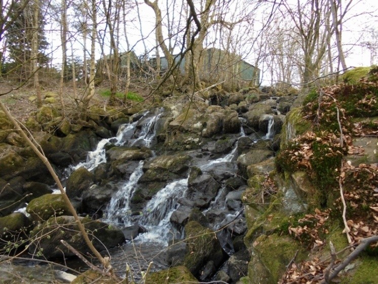 The original mill lay immediately to the west of the linn at the foot of a large ridge of rock over which the burn cascades. Cutting channels in this whinstone is no easy task and they follow natural fissures which have been artificially widened. We can therefore be pretty sure that the mill dam and lades were little changed over the years. The mill pond lay on the top of the ridge to the west of the stream.