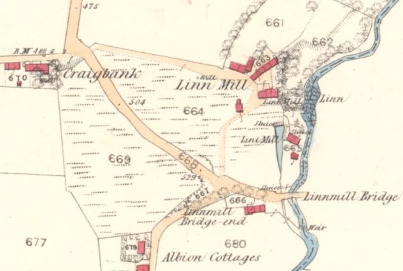 The name of this mill derives from a waterfall immediately to the east of the buildings described in 1860 as “a very beautiful waterfall, upwards of 60 feet” (Ordnance Survey Name Book), though it has since lost some of its former glory. The stream itself is also named after this linn – the Linnmill Burn which continues north to the River Avon and forms the boundary between Stirlingshire and Linlithgowshire. Linn Mill Bridge on the road from Avonbridge to Strath is likewise so named and from this we get Linnmill Bridge-End for the nearby cottages. Linnmill Brae is the name of the road from there to Avonbridge. Yet the stream has an older name – the Polness Burn, meaning “burn of the waterfall.” (Reid 2009 170).