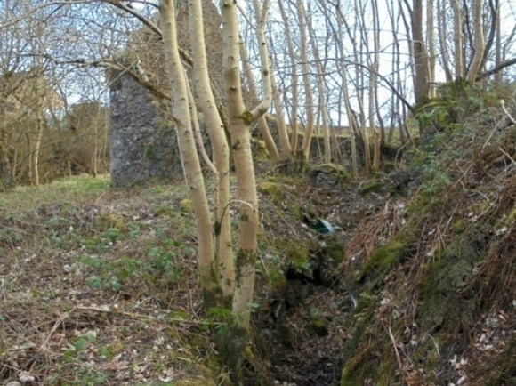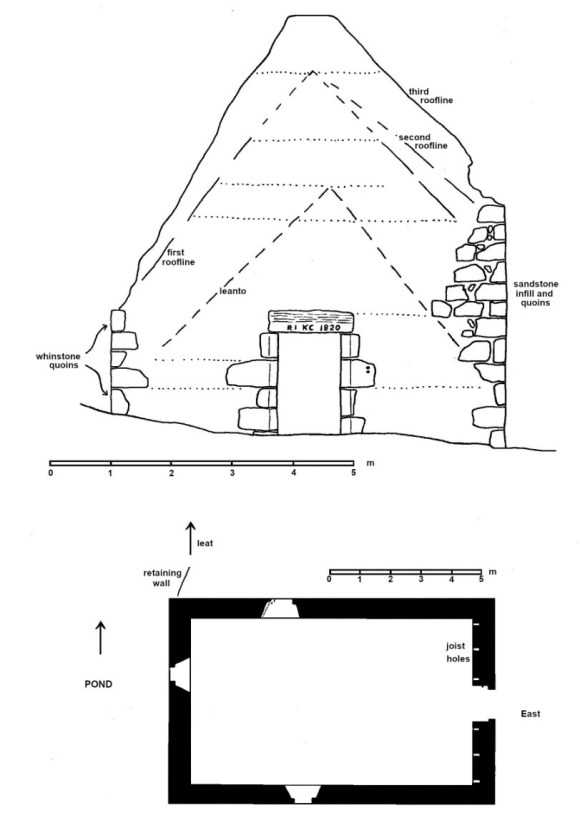 Chamfered windows can be seen in the north and south walls, though that in the north has lost its western side. There is also a window aperture in the west gable. It is well to the north of the centre and its displacement can be accounted for by the presence on the outside of the water wheel. The window would thus have acted as an inspection hatch. The lower part of this wall is now buried under wall tumble and soil eroded from the bank of the pond. It was not therefore possible to verify if it was of a higher quality that the others, as might be expected due to the need to keep the water out. Recent landscaping work has hidden or destroyed the path of the lade to the north of the building.