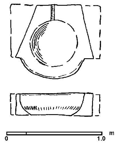 - “Carved Stones, Loanhead. Loanhead Cottage, as it now stands, represents a recent reconstruction of part of a row of cottages, the other end of which stands roofless; the date 1829 appearing on a chimney is presumably that of their construction. In the N. side there is an outshot with a window in its centre; the lintel of this window, evidently in secondary use, has borne an inscription, no doubt initials and a date, but only the final figures 70 are now legible. Inside the outshot, in its W. wall, there is a recess 1ft. 8in. wide across the front, 1ft 2.5in. deep, and rhomboidal on plan. Its floor is formed by a stone hollowed out to form a circular basin 2in. deep, the rounded front of which projects 2in. from the face of the wall. Running back into the inner side of the stone from the bottom of the basin, with which it is flush in the centre, there is a slot three-quarters of an inch wide; this ends in a small hole which gives into the wall behind in the manner of a drain. Nothing is known as to the origin or purpose of the stone but, like the lintel, it has probably been rest here for preservation. 844721 NS 87 SW 10 April 1954.” [p.405]