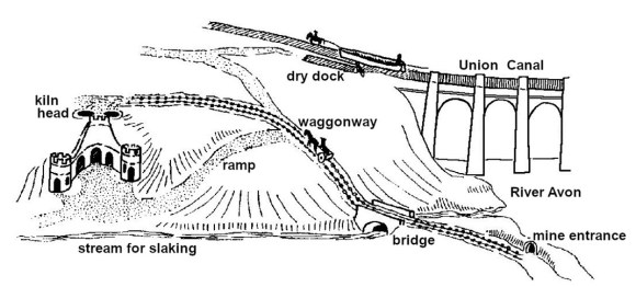 On the Muiravonside Estate conditions for the location of a draw kiln for producing lime seem to have been favourable. Coal was available on the estate, and the Castlecary Limestone outcropped in a seam just over 4ft thick on the banks of the River Avon adjacent to the Union Canal. A pair of large kiln pots was accordingly constructed against the natural hillside near to the limestone seam.