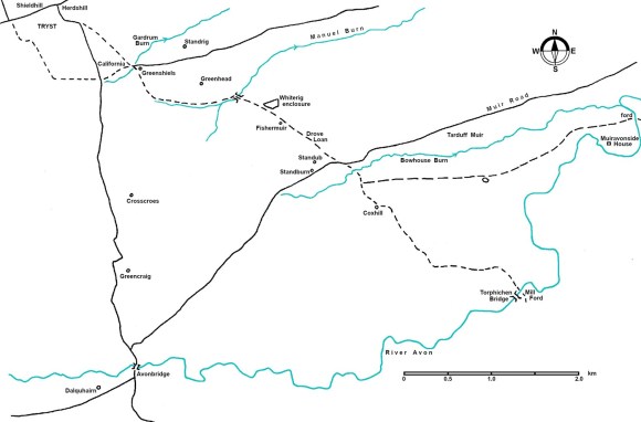 Another major drove road went due south from the Tryst ground to make for the crossing on the River Avon at Avonbridge which, as the name suggests, was by a single-arch stone bridge (SMR 871) built in 1640 by the first Earl of Callendar. This was the bridge referred to in 1723 by Johnson of Kirkland :