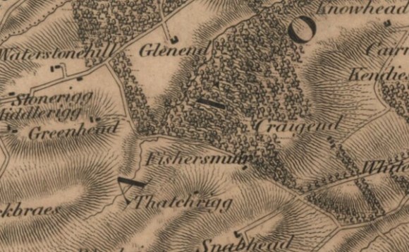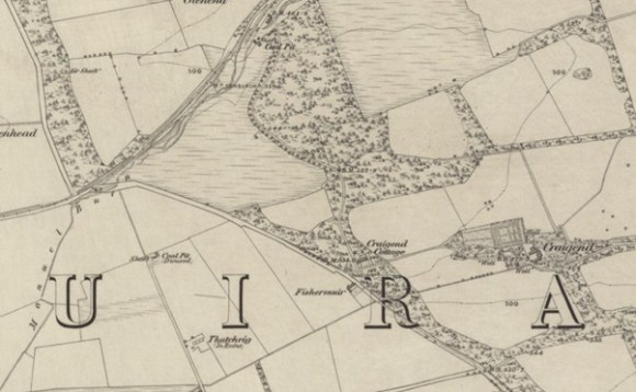 The drove road then cut off to the south-east, crossing the Manuel Burn by a stone bridge. Such bridges were not necessary for the cattle, especially here where the bed of the stream is formed by bedrock. This road was also a main route for other traffic. Here the drove road formed the western boundary of the estate of Parkhall and was referred to as the “Drove Loan” (Caledonian Mercury 5 June 1820, 1). This part of Parkhall was made up of the lands of Craigend and Whiterigg.