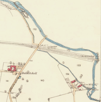 This mill is shown at Balmitchell on General Roy’s Survey of 1755. It is named “Lady Ann’s Mill” on the Slamannan Parish map of 1806 and was “New Mill” from at least 1817 when it appears on Grassom’s map.