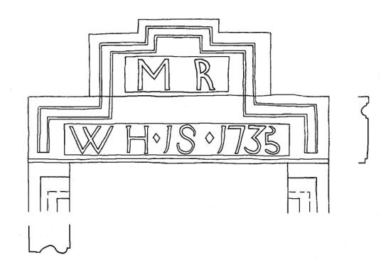 The house is relatively modest and measures only 29ft by 19ft externally. It is built of random rubble sandstone with a grey render. The façade is typically symmetrical with one window on either side of the central doorway, and two others on the first floor above them. The jambs of the doorway bear roll-and-hollow mouldings returned at the top; the inscription on the lintel is in bold and raised letters on sunken panels. The front windows have all been enlarged, but a small original window, with rounded arrises, which lights the stair, can be seen in the centre of the back wall together with a smaller one, of irregular shape, at ground floor level. In the north-east gable a window on the first floor has been built up, but a small one remains to light the roof space above. The gables are crow-stepped, and the existing steep slate roof replaces an original roof of thatch. Internally there was a room to the right of the entrance, a stair in the centre of the house, and a hall and pantry to the left; and two rooms on the first floor.