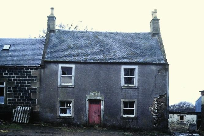 - Description: 2 storey, 2 upper windows central doorway with date 1735. Ridge roof with crowsteps and end stacks. Grey render. Later (1867) extension adjoins to left. Random stone farm buildings to left. References: Inv 319 Notes: New window at rear of oldest section