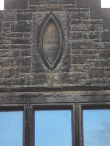 The architect was Mr Baird of Airdrie and the building cost £1,400. Its east gable faced onto the road and was made of bull-nosed masonry containing a tall three-light hood-moulded Jacobean window flanked by similar single-light windows to either side at a lower level. The gable is topped with a crowstepped skew surmounted by a large panelled finial. An inscription in an elliptical panel below this reads “1900/ PARISH/ CHURCH/ HALL/ ALLAN REID/// MINISTER.” The side walls are of random rubble and have four plain rectangular windows each, divided into two by protruding porches. A single storey kitchen and toilet block lay on the west end of the building.