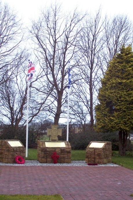 An open area of public ground on the north side of the High Street in Slamannan was utilised to commemorate the centenary of the First World War. Three square stone plinths with sloping panels were placed in front of flag poles at the end of a paved path to commemorate Samuel Frickleton VC (1891-1971), Alexander Penman MM & Bar (1896-1961) and soldiers since 1945. The central plinth has a large representation of the Victoria Cross on it. They were unveiled on 3 April 2010.