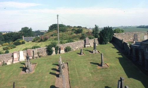 The minister must have been reporting a tradition as well as making his own judgement of the topographical setting.  At the time the old church was still standing and the hill upon which it stood was more prominent than now, having been further truncated by the rebuilding of the church in 1810.  This second mound would have been used as part of the bailey of the castle and its former enclosure is reflected in the curved south wall of the later churchyard.  A similar situation occurred at Dunipace.