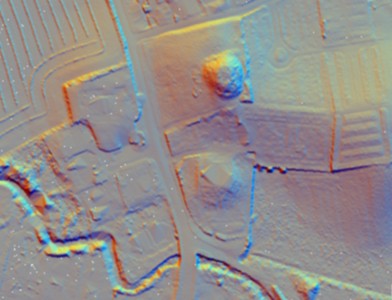 Illus: Lidar Survey showing the motte as a prominent mound, with a smaller mound to the south housing the church (National Library of Scotland).