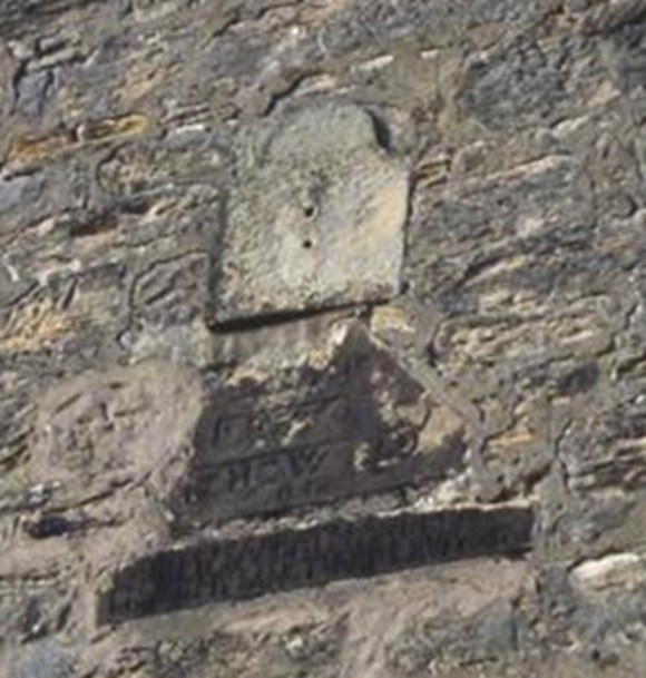 A stone built into Loanhead Cottage is reputedly the old font or piscina; and a dormer pediment built into Binniehill Farm is also said to be from this building. A piece of worn sandstone has been re-used in the present church at hip-height at the southern end of the east wall and bears the date 1722 or 1728 (the last two figures being very faint).