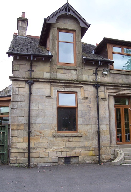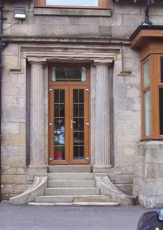 A large two-storey wing was built onto the east end at the north side of Southfield House. It projected slightly to the east and the resulting re-entrant angle was filled by a single storey ashlar block in a slightly pink sandstone bearing a flat roof terrace. Attached to this was a pillared porch in the form of a raised quarter circle with steps fanning out below and plain fluted columns supporting a flat lead roof – the columns reflecting the earlier ones.