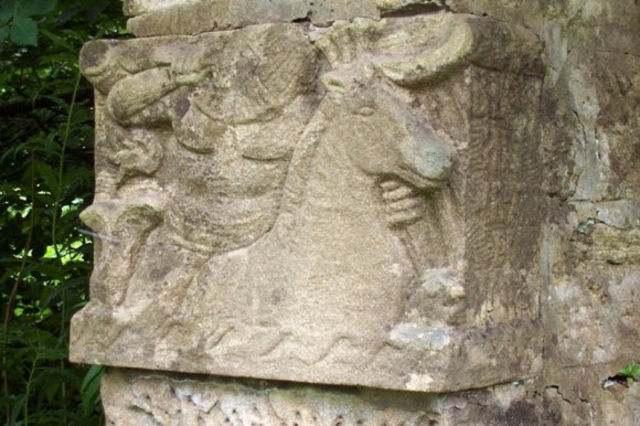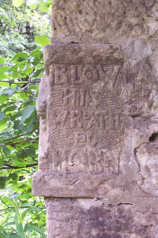 The Art Nouveau style more keenly seen in the summerhouse to the south of the dwelling. A series of carvings and mottoes occur at shoulder height – such as a horseman blowing a horn “BLOW/ HIS/ WRATH/ED/ HORN”.