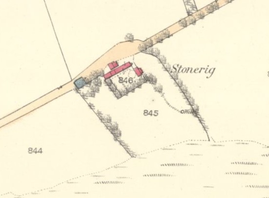 - “Old Building, Stoneridge. The doorway that gives entry to what is now the scullery of Stoneridge farmhouse has widely chamfered jambs and an inscribed lintel, all heavily weathered. The lintel appears to have borne initials and a date, but today the initials are illegible and the date has nearly disappeared. It is probably to be read as 1694, the last two digits being fairly clear. The doorway is no doubt in situ, but the building as a whole must have been greatly altered. The barn at the E. end of the steading bears the date 1720 on the lintel of its outer door, and both this door and its counterpart in the opposite wall have chamfers of the period and also internal lintels of wood shaped to a slightly arched form. 879700 NS 87 SE 1 April 1956” [p. 383]