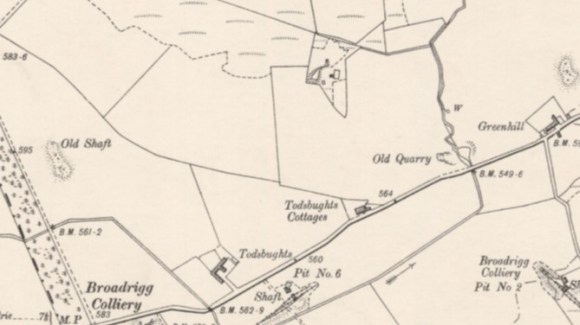 The works came into existence during the last quarter of the 19th century between the production of the first and second editions of the Ordnance Survey maps. They were constructed immediately to the north of an earlier coal pit and presumably used to bing from it to produce commons house bricks. Todbughts Farm was managed by a Mr Watt, and the brickworks were operated by Messrs J. & J. Findlay. The nature of the works meant that they only had a limited life and the site was later occupied by Sharphill Cottages