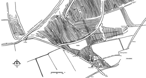 This agrees with the 1822 advert stating that “the Plantations on this Estate [Craigend] are of very great extent” (Caledonian Mercury). The wood was considered to be fit for stobs and rails, suggesting that the trees were not old. It is probable that the western field was deforested and the enclosure formed as part of the creation of the estate after the sale of 1820 when a new mansion was built. Although the enclosure is on a south-facing slope, the woodland to its south would have hidden it from the new House and so the purpose of the enclosure is uncertain. It is possible that it provided a secure area for the cattle using the Drove Loan.