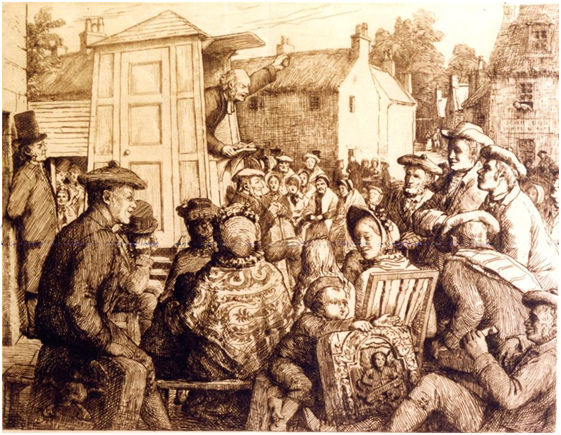 The large number of ministers involved at that Denny Sacrament shows the presence of communicants from neighbouring parishes whose clergy would assist at the sacrament days. In his poem ‘The Holy Fair’ Burns mentions five preachers at ‘Mauchline Fair.’ The congregation being far too large to be contained by the quite small church buildings of the area, it gathered by custom in the kirkyard or in a neighbouring field. In order for the various preachers to be seen and heard by this multitude a wooden structure was erected outside; this ‘tent’ as it was called both sheltered the preacher from the elements and elevated them above the crowds. It also served as a focal point for the meeting. The Dictionary of the Scots Language defines it thus:
