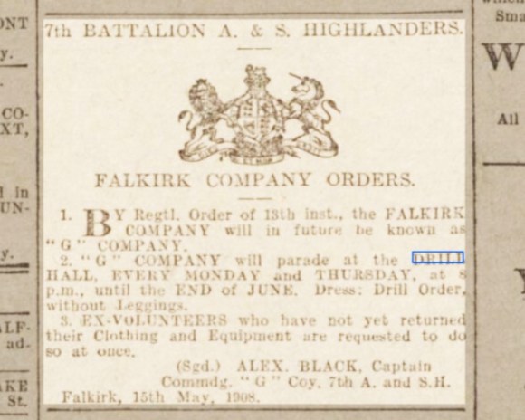 The members of C, D, and F Companies of the former Volunteers paraded in the Falkirk Drill Hall in April to have the conditions of service in the new Territorial Force explained to the men. Only one company in the town was to be attached to the 7th Battalion Argyll and Sutherland Highlanders, and for this only 120 men were required. Despite all the dire warnings, about 200 men intimated their willingness to enlist in the local company.